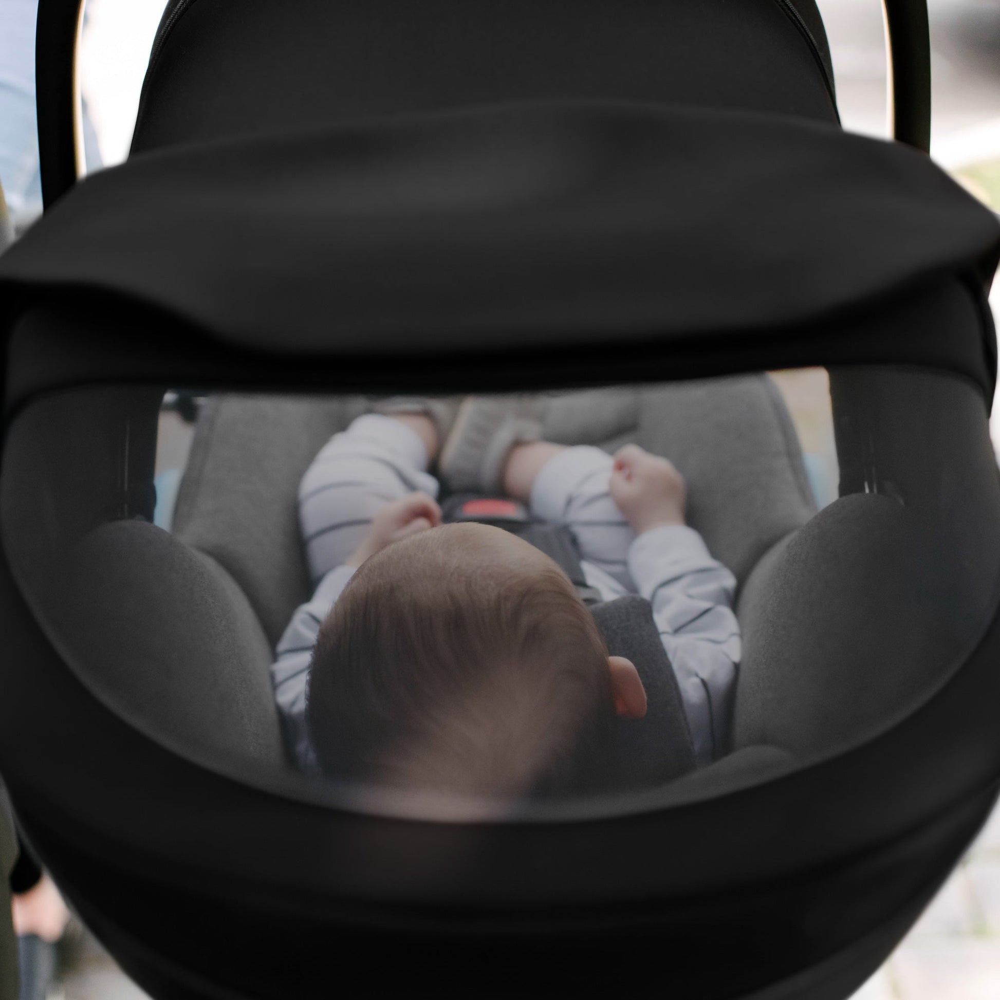- The 3-position, SPF 100+ adjustable sun canopy provides almost full coverage from the sun, with a mesh peekaboo window for airflow and visibility into the car seat.