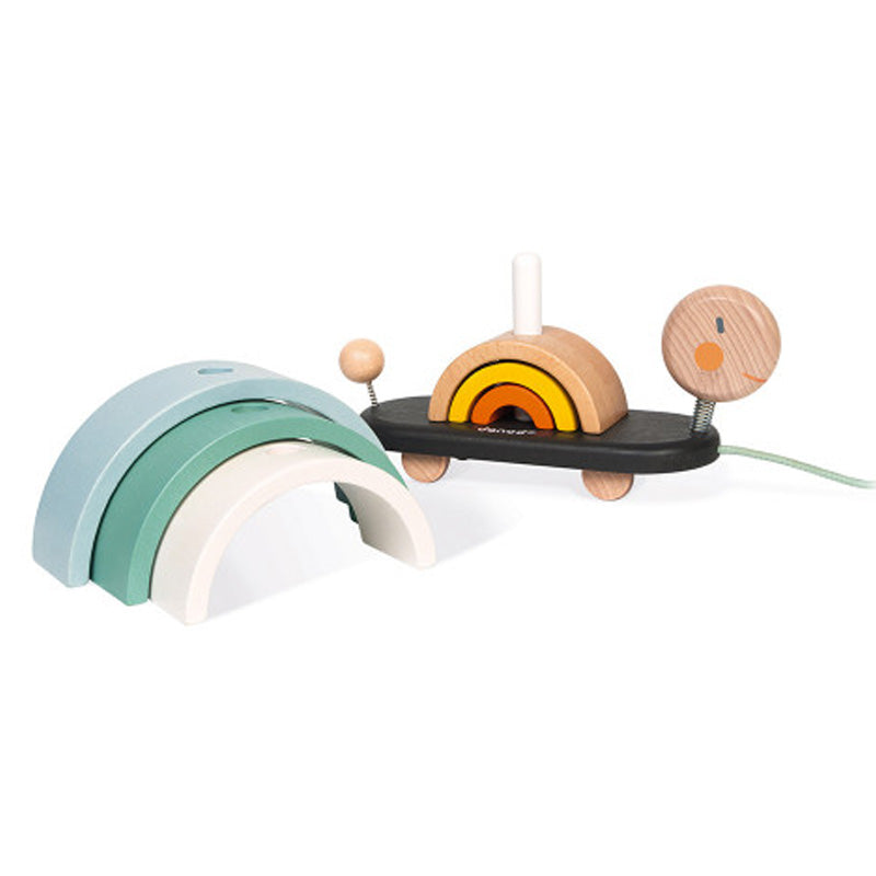 Your child will love to walk this pretty wooden turtle with its rainbow shell composed of 6 wooden arcs of circles. The rainbows pile up at will to form an original construction game. This wooden toy is part of the Sweet Cocoon collection, a delicate colors range, inspired by current trends to gently accompany your child's first learnings!