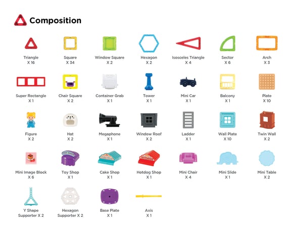 The Set Comes With X16 Triangles, X6 Squares, X2 Window Squares, X2 Hexagon, X4 Isosceles Triangles, X6 Sector, X3 Arch, X1 Super Rectangle, X2 Magnet Swing, X1 Grabber, X1 Stand, X1 Car, X1 Balcony, X10 Base Plates, X2 Magbuddies, X2 Magbuddies Hat, X1 Siren, 1 Lookout, X1 Ladder, X10 Window, X2 Balcony Window, X6 Mini Blocks, X1 Toy Shop, X1 Hotdog, X1 Cake Shop, X4 Chairs, X1 Elephant Slides, X2 Table, X6 Carnival Wheel Accessories.