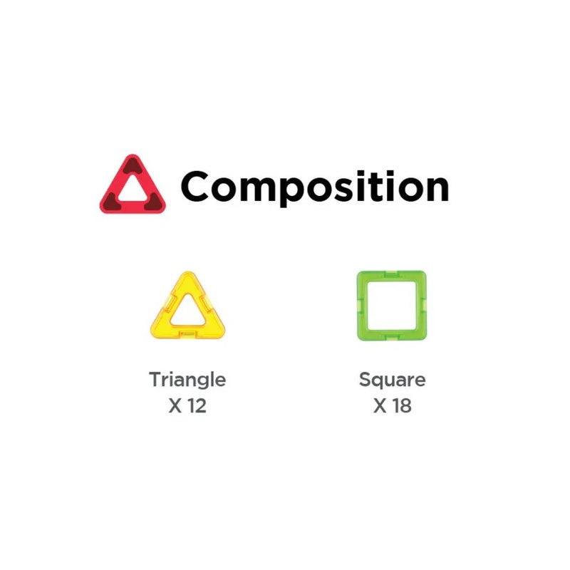 3D MAGNETIC BLOCKS: The original and authentic Magformers. 30 magnetic geometric shapes. 18 Squares and 12 Triangles in Rainbow Colors. Create in 2D and pull up into 3D. Build without limitation.