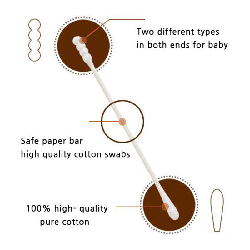 100% cotton hygiene buds. Natural, suitable for newborns cotton buds with different tips and a paper stick. Special pen-shaped safe for babies.
