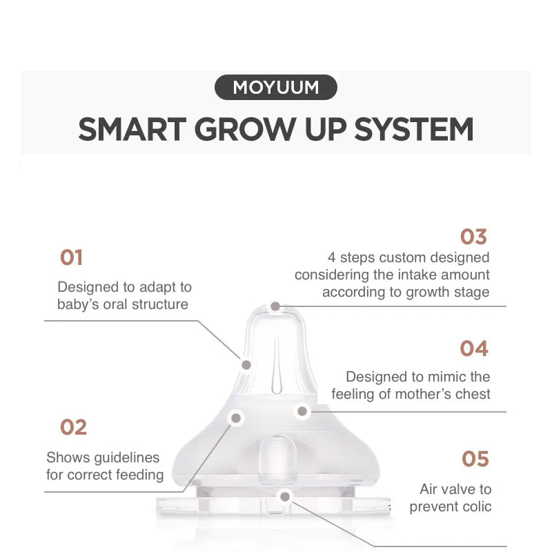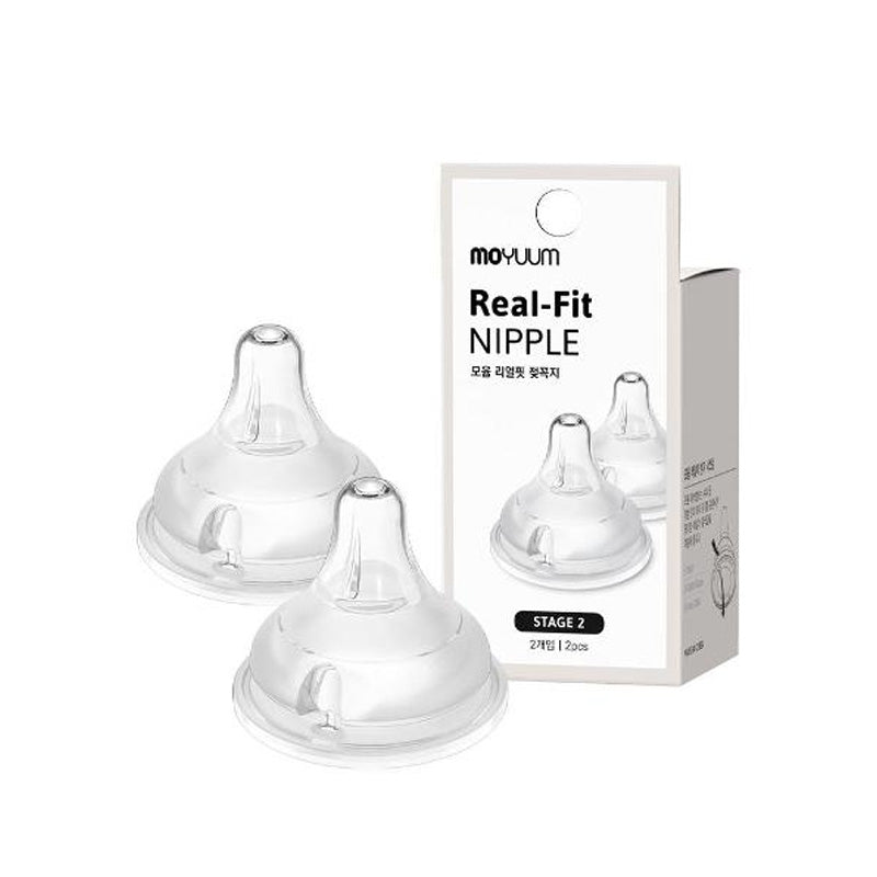 Moyuum Real Fit Nipple is a pack of 2 nipples that embodies the mother's breast, so babies can easily transition to bottle feeding. The real-fit nipples are made of premium liquid silicone material with a soft texture. It is easy for babies to transition into bottle feeding thanks to its close resemblance to the mother's nipples. Made in Korea with tough quality control. You can be sure of its safety! With an air-vent system that prevents colic and allows smooth circulation of contents. Specially designed to resemble an Asian mother's nipples while providing a comfortable fit for the baby's oral structure.