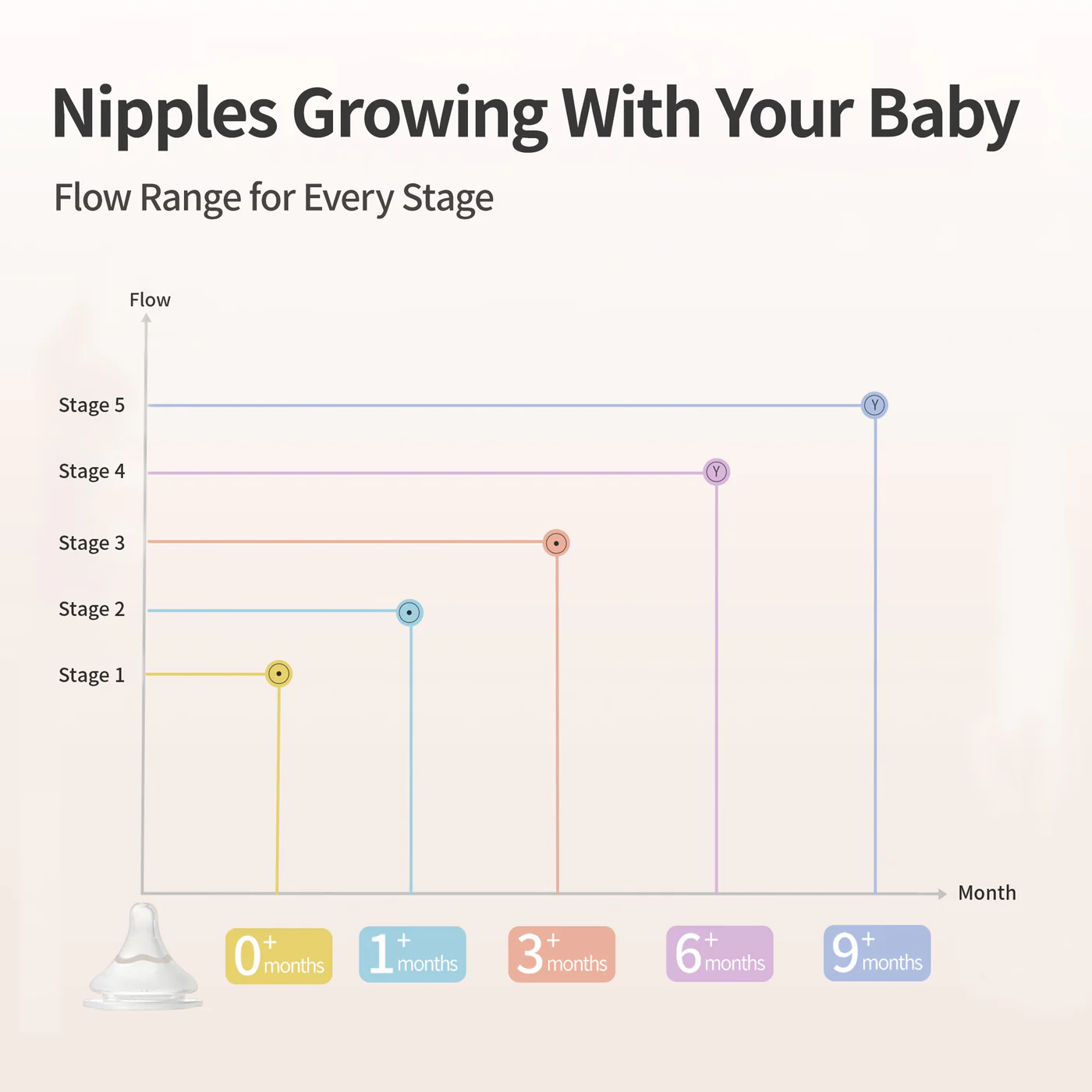 - SPECIFICATION: 5.4 oz (160 ml) bottle comes with Stage 1 nipple (0 m+), 8.1 Oz (240ml) bottle comes with Stage 3 nipple (3 m+). Nipple size comes from Stage 1 to Stage 5 with specific hole size shape, thickness and softness, different sizes for babies of every age. Recommended Age: 0-6 months.