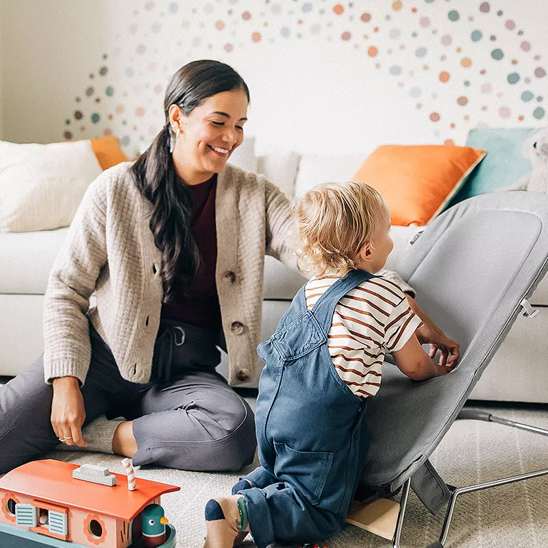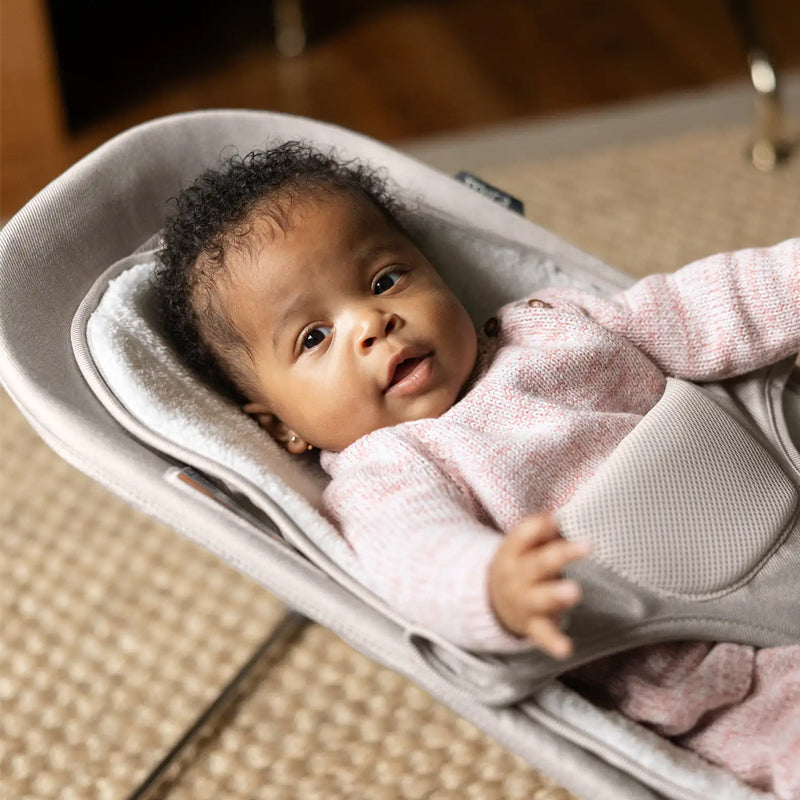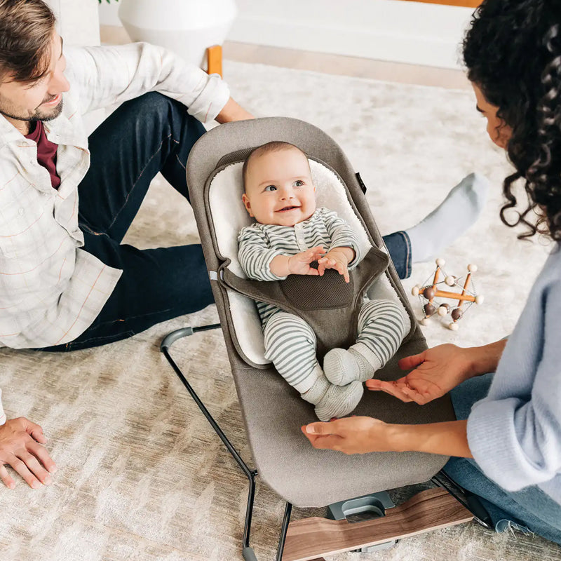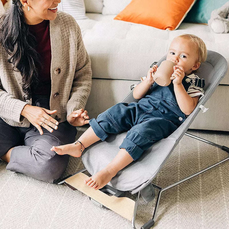 A cozy place to play or lay, the Mira was designed to soothe and comfort baby while keeping them close. Following their natural movement, the 2-in-1 bouncer and seat gently rocks to their rhythm from newborn to toddler.